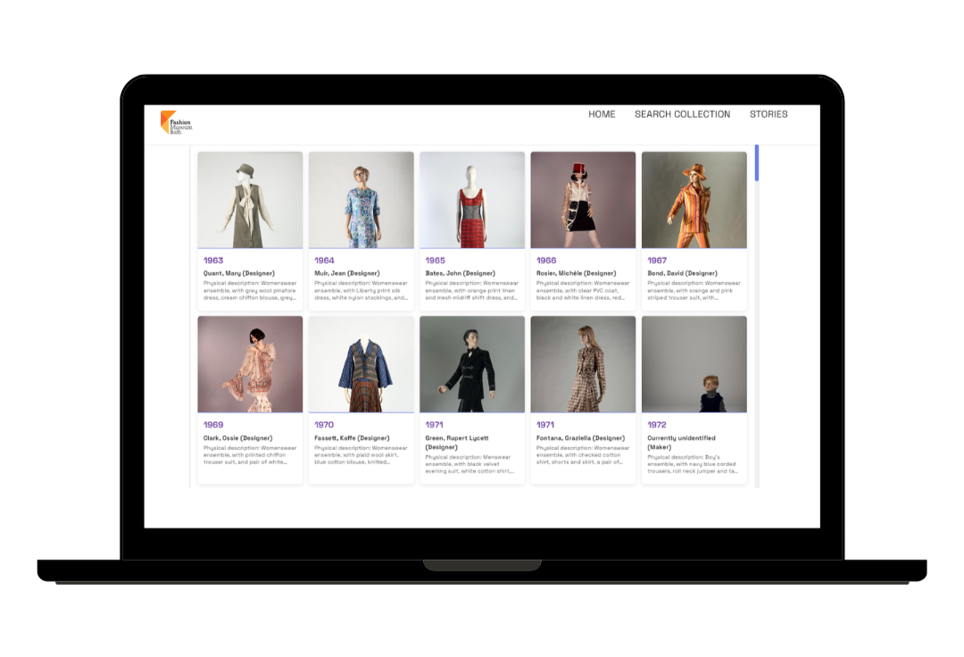 Explore the Collection is a new digital prototype, the first online collections catalogue from Fashion Museum Bath. Help shape what comes next Discover fashion in new ways A first digital step towards the new Fashion Museum Bath Our Thanks