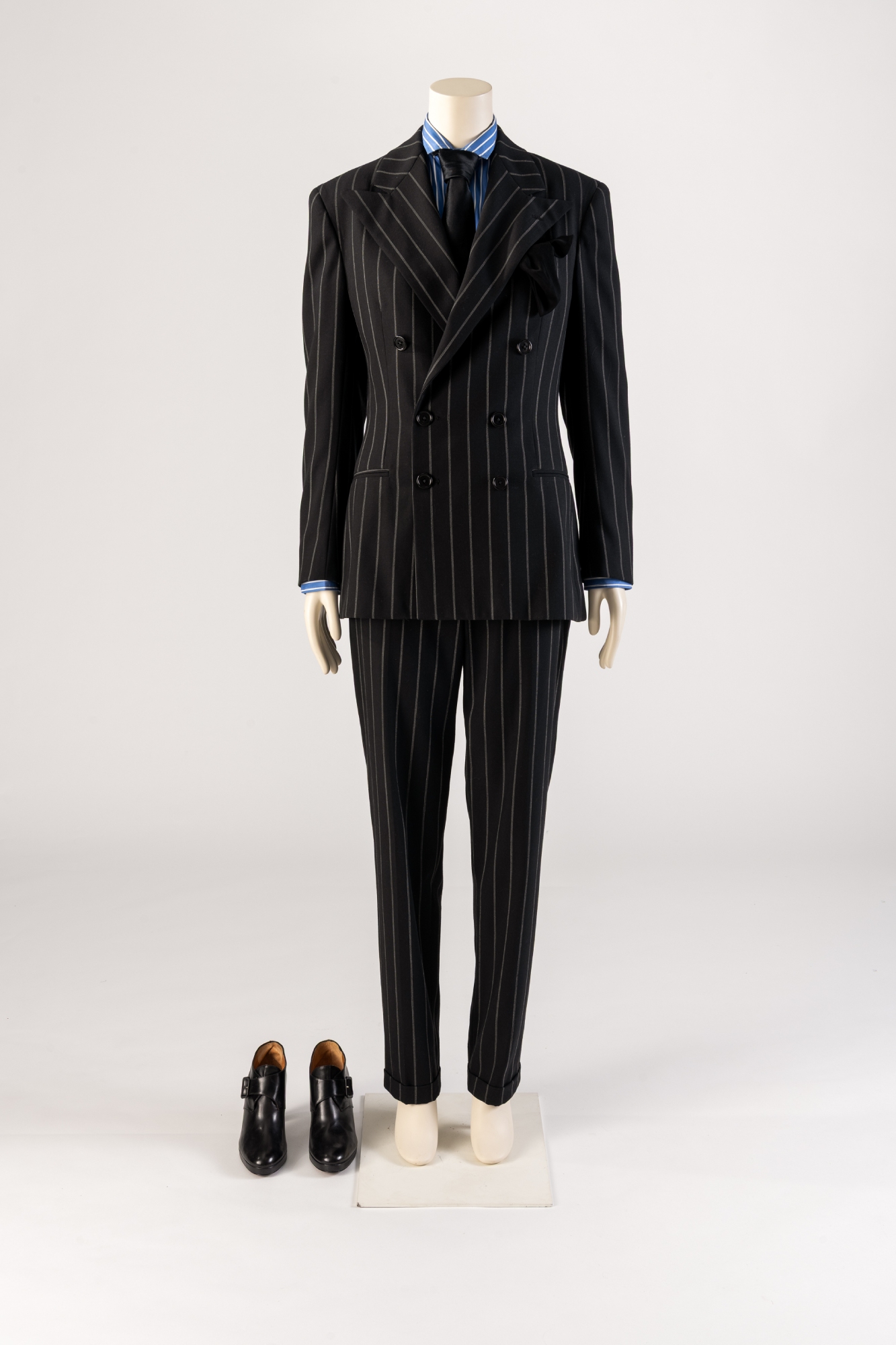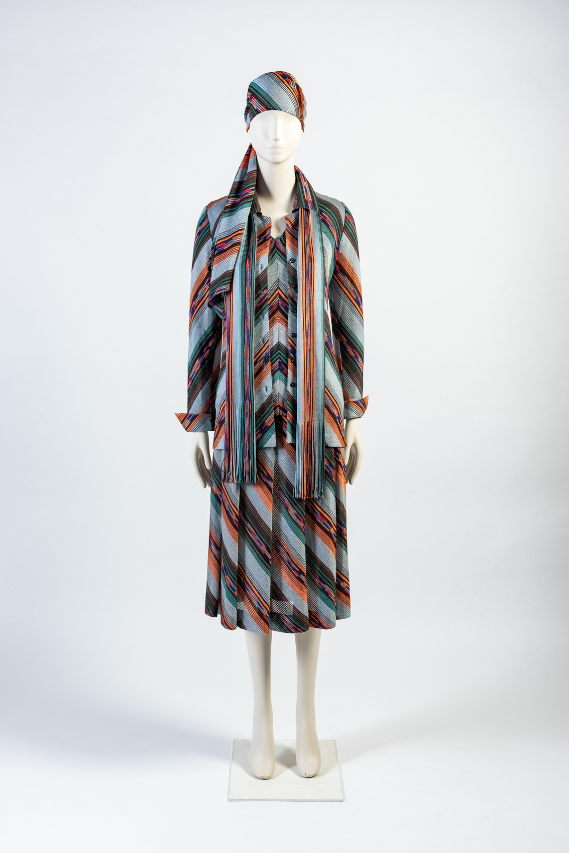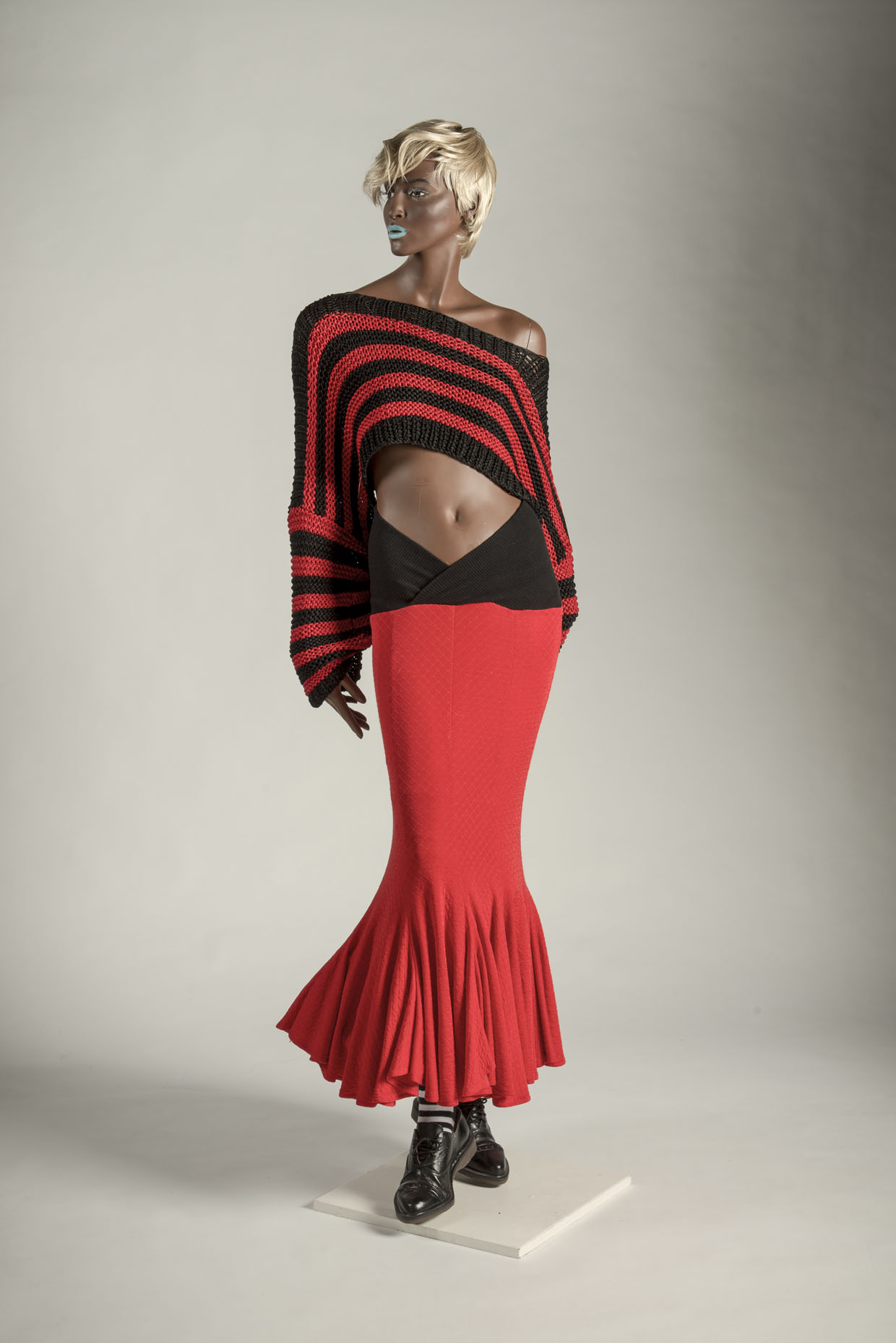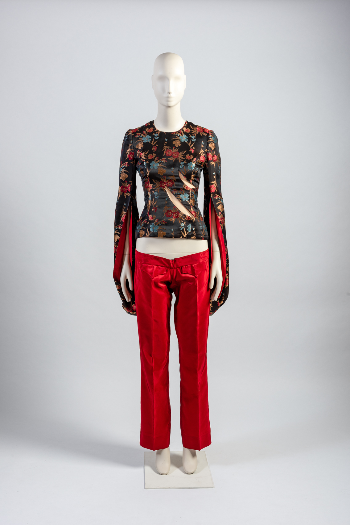 2017 Dior Tshirt, jacket & skirt; 2010 Vivienne Westwood silk dress;1972 Biba red dress & boots; 2023 Bianca Saunders printed men’s suit; 1984 Bodymap striped ensemble; 1985 Scott Crolla men’s velvet & brocade outfit; 2000 Versace green silk dress
